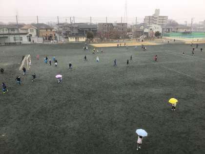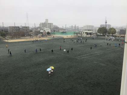 雪が舞う長方課中の運動場です。