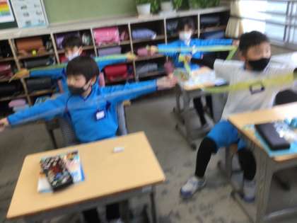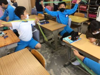 ビニールひもを使って、1mの長さがどれぐらいになるか予想しています。