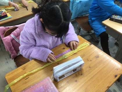 みんな真剣です。1mの長さはどれぐらい?「10cmの10こぶんだから、これぐらい?」と頑張っていました。