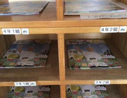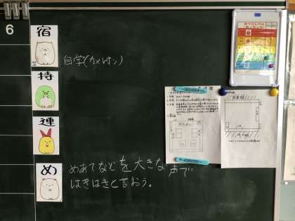 1枚目と2枚目は、それぞれ何組の背面黒板でしょうか。また、配付棚には明日に配付する予定のお知らせが入っています。楽しみにしていてください。明日も、元気にお会いしましょう。