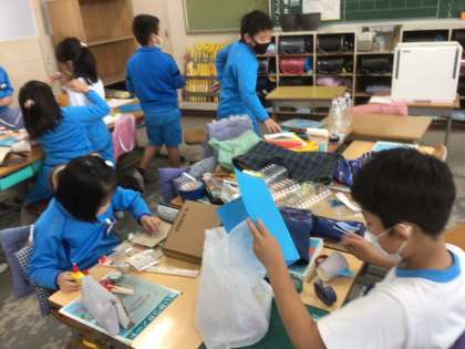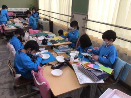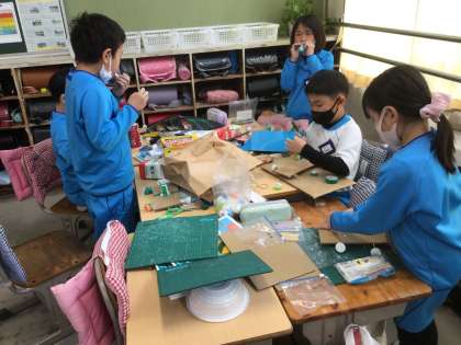 グループ活動が、始まっています。今日は、準備できた持ち物でおもちゃ作りをしました。なかなかスムーズにおもちゃが作れず、悪戦苦闘しました。