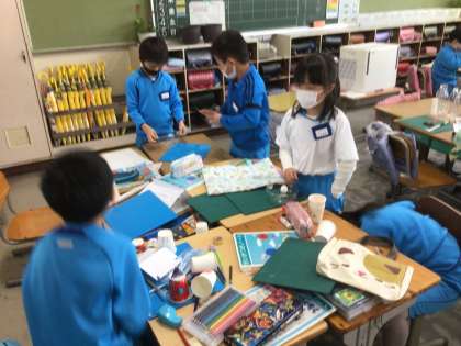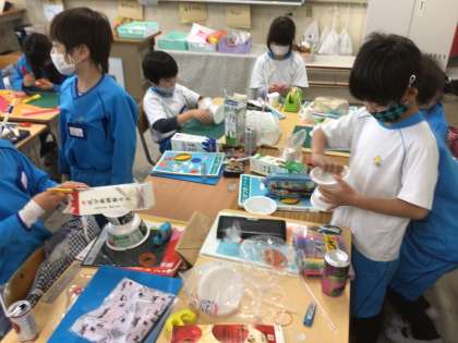 おもちゃ作りです。机の上に材料をいっぱい並べて、みんなで作っています。何ができるかな?
