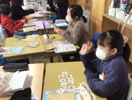 今日は、果物のカードを使って、互いに英語で質問をして互いに答えていました。
