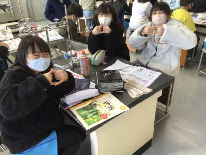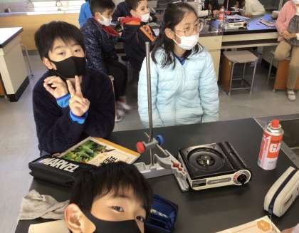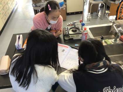 今日の授業は、理科室で金属の温まり方の実験を行いました。実験から金属を熱すると熱したところから遠くへ温まっていくことが分かりました。