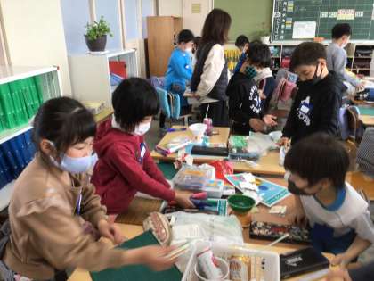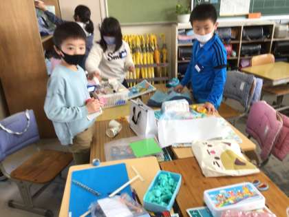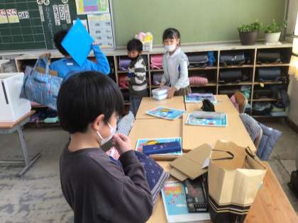 「おもちゃパーティを開こう」の学習です。今日は、グループで遊んでみました。楽しく遊ぶ遊び方を見つけられるといいですね。さて、遊んだ後は片付けです。約束の時間に気付き、みんなで声をかけ合いながら片付けました。