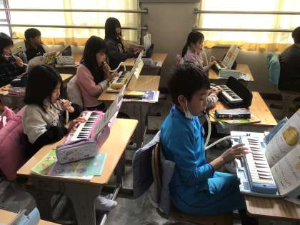鍵盤ハーモニカで演奏です。自分で練習する時間があり、思い思いに吹きました。