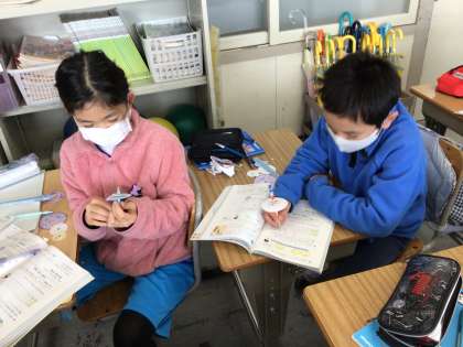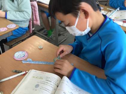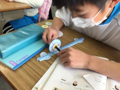 円周測定マシーンを使って、円周と直径の関係を調べました。