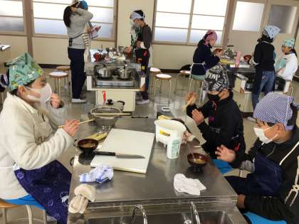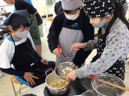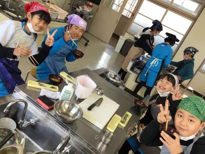 協力して味噌汁調理実習を終えました!自分で作ったエプロンを着てつくる時間は楽しそうでした!