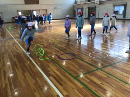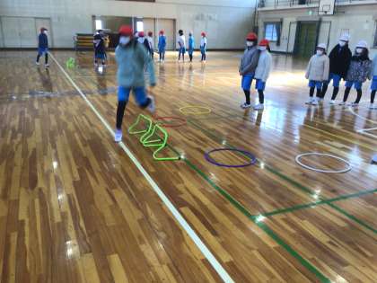 高跳びの授業です。 跳びやすい踏み切り足探しや、 リズム良く跳ぶ練習をしました。