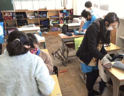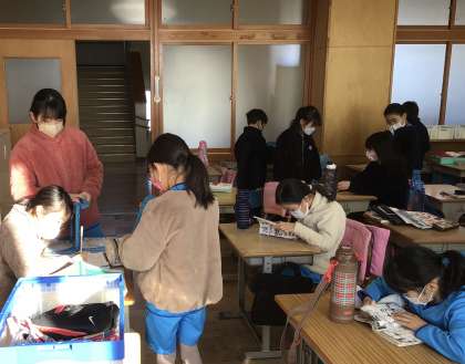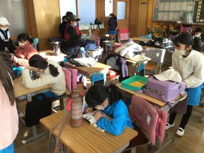 教室では、朝の準備をしています。宿題を提出したり、読書をしたりしています。