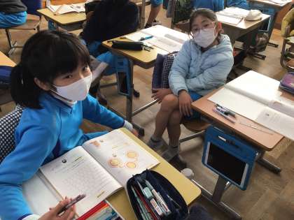 今日は、大きさの等しい分数について考えました。考えたことを隣の席の友達と話し合いました。