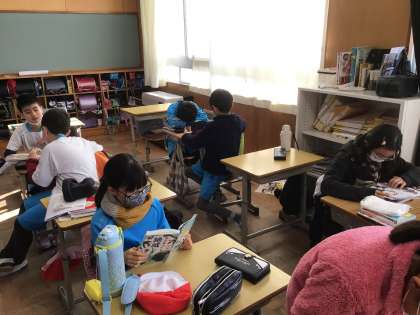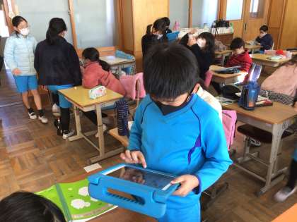 今朝の様子です。読書をしている子もいます。学級委員が宿題の自主学習を学習用タブレットで行ってきた子の確認をしています。