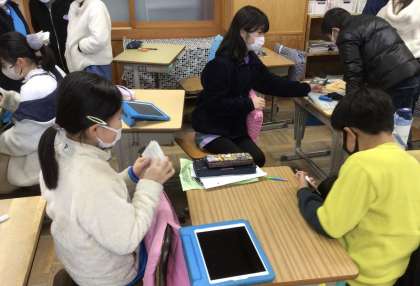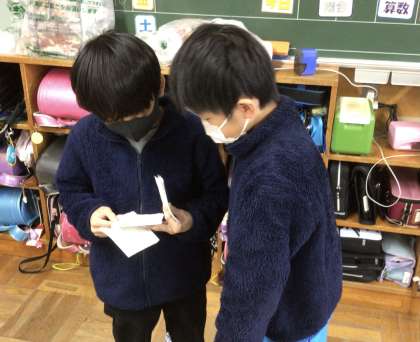 発表会の練習が終わった後に、友達が書いた良かったところやアドバイスの用紙を読んで、さらに素敵なプレゼンテーションができるようにグループで振り返りをしました。