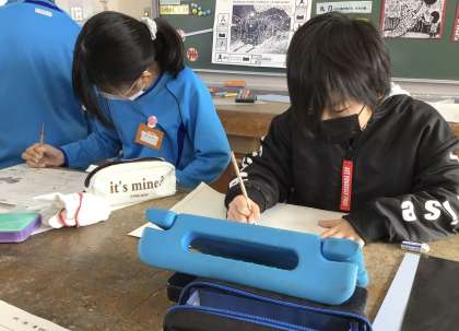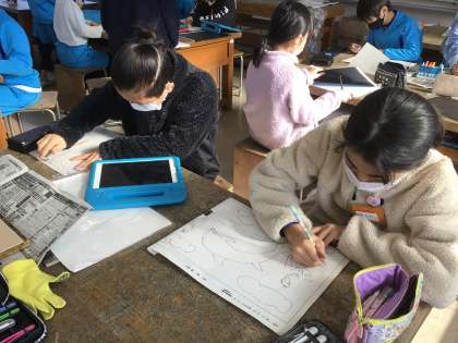 どんな生き物を描くのか、学習用タブレットを使って調べている子もいます。どの子も真剣な表情で作品を作っています。