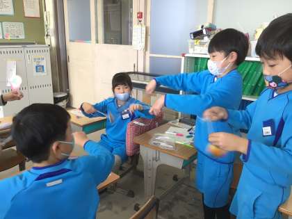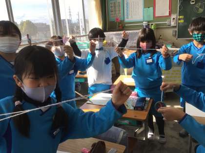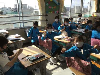 「見て見て〜」と、ぶんぶんごまを回しているところを見せてくれました。描いた模様が、きれいに見えました。今日、持ち帰りますね!