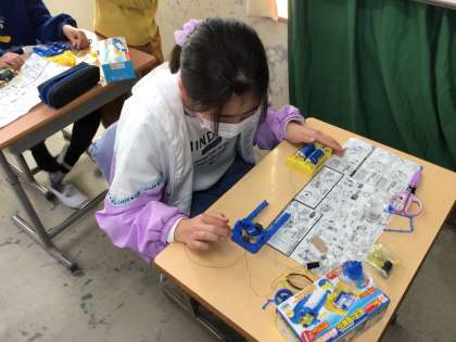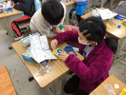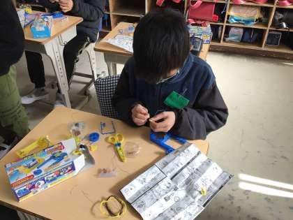 電磁石を使って、モーター作りをしました。友達同士で助け合う姿が見られ、とても良かったです。