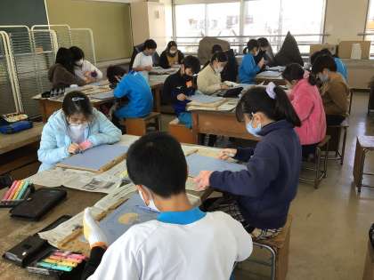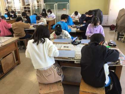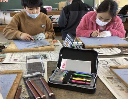 図工室で彫刻刀を使って版画を作っています。