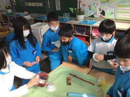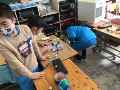 友だちのグループへ回って、遊び体験です。作り方や遊び方を教えてもらい、進めました。