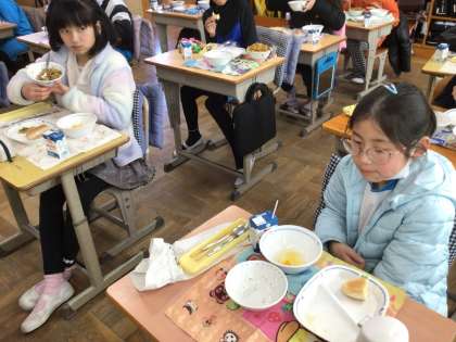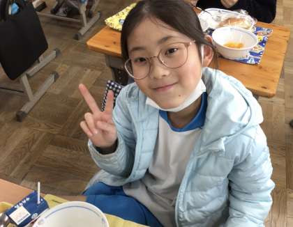 昨日のメニューは、米粉パン、焼きそば、ナムル、ミックスフルーツ、牛乳でした。今日も完食です。食べ終えてピースをしています。