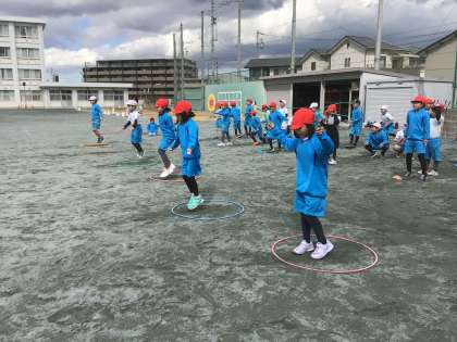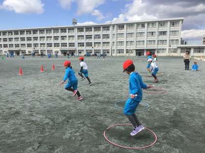 縄跳びを使って、リレーをしました。フラフープの中で跳んだり、コーンを回ったりしてグループで楽しみました。