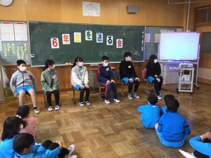 3時間目に6年生を送る会が行われました。ジェスチャー伝言ゲームで盛り上がりました。