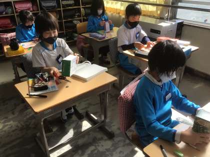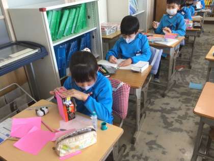 「はこの形」の学習です。空き箱に、自分で作った面を貼り付けました。面の形や大きさ、同じところなど確認しました。