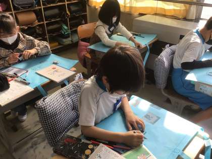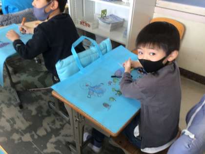 作品バッグに、自分で絵を描いています。2年生の思い出になりますね。