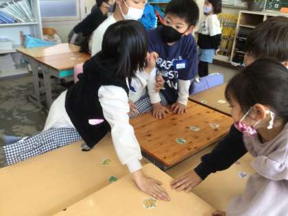 かるたとりは、フィリップ先生の言われたことに耳をすませ、カード取りをしました。動物の名前や色を聞いて、素早く反応しました。