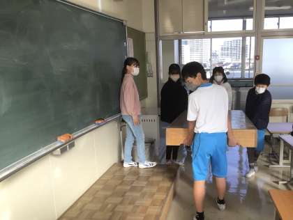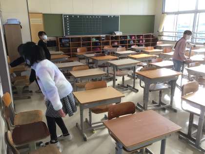 前日に中学年多目的室のワックスがけを行ったので、廊下に運び出したイスや机を教室に戻しました。