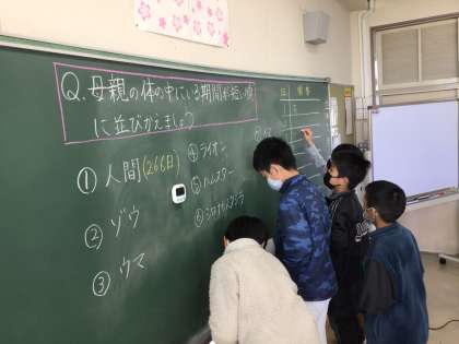 動物の生まれる順番について考えました。生まれる数や寿命など、いろいろな要因で生まれるまでの期間が変わることを学びました。