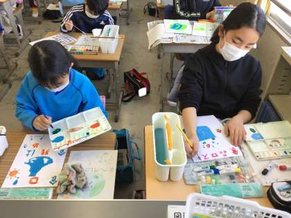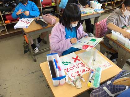 食品ロスを減らすことを呼びかけるポスター作りを進めています。みんな集中して取り組むことができていました。