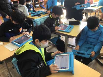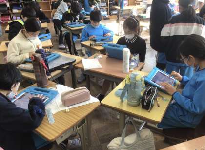 「調べたことをほうこくしよう」では、班ごとにFormsを使ってアンケートを作成し、クラスのTeamsを使ってアンケートを送信しています。送信が終わった班から、送られてきたアンケートに答えています。