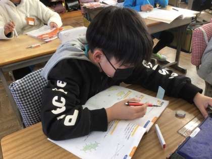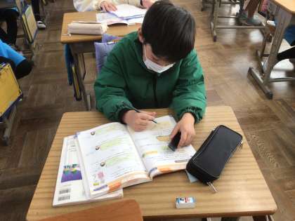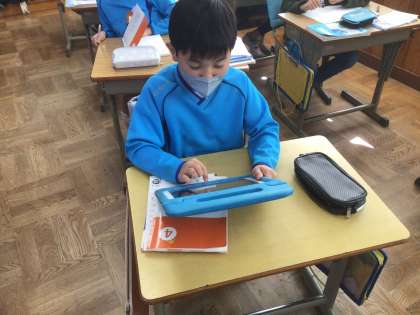 1組の様子です。学習用タブレットでQubenaの問題や問題集の問題を自分のペースに合わせて解いていました。