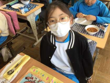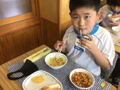 メニューは、米粉パン、ポークビーンズ、フレンチサラダ、オムレツ、牛乳でした。昨日も完食しました。