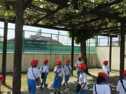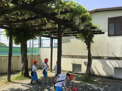 運動場の藤だなの辺りにも、行ってみました。花がたくさん咲き、ぶどうのふさのように垂れ下がっている様子を「なんだか、おいしそう」と言っている子もいましたよ。