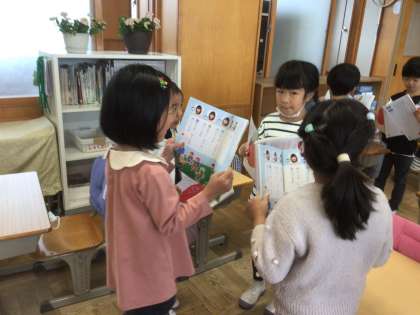 友達と「あいうえおのうた」を読む練習をしました。まだ、ひらがなを習っていなくても、耳で聞いて覚えた言葉をたよりに、がんばりました。