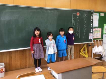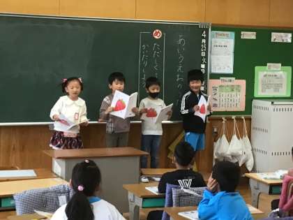 大きな声で、発表しました。口の形に気をつけて、友達と声を合わせました。とっても嬉しそうでした。