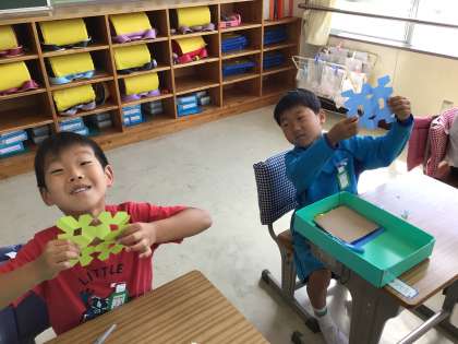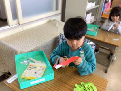 紙を折ったり回したりして、はさみで切ってみたら、すてきな飾りができました。
