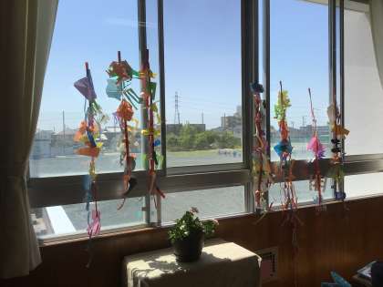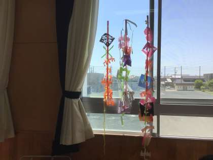 「ちょきちょきかざり」の学習です。折り紙で作った作品が、完成しました。風に揺れて、きれいですよ。