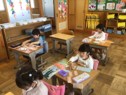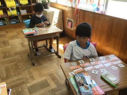 「かずとすうじ」の学習です。今日は、10までの数字、習いましたよ。少しだけ、数が多くなりブロック並べも、大変に感じたようです。