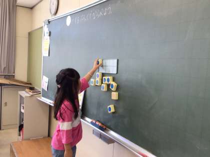 数字を聞いて、ブロックで正しく並べる練習をしています。
