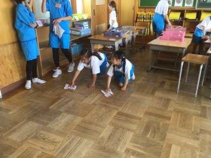 机ふきや床ぞうきん、手際よくできるようになりました。みんな、6年生のおかげです。どんなときも、とってもやさしく教えてもらっています。