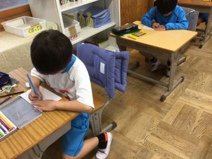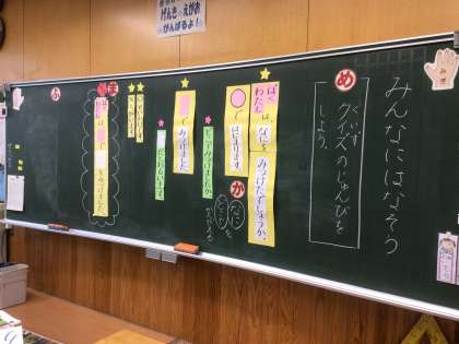「みんなにはなそう」の学習です。習ったばかりの文を使えるように、クイズにして練習します。今日は、こたえを絵で描いて準備しました。