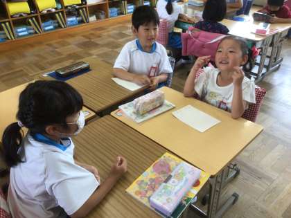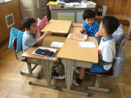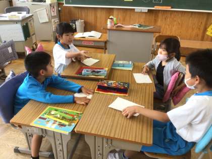 グループでの発表がはやく終わると、新しい問題を作って友だちに出し合っていました。話すのが、あっという間に上手になりました。