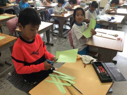 ものさしを使って2cmをはかり、わっかのかざりを作りました。