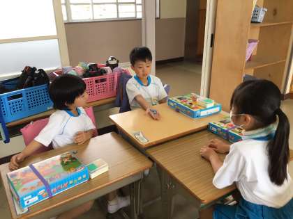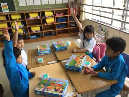 「いくつといくつ」の学習をしています。 おはじきを手に持って、班で問題を出し合いました。