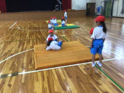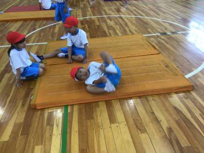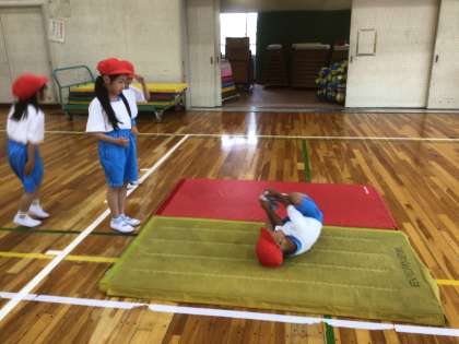 「マットあそび」の学習です。今日は、「ゆりかご」と「だるまころがり」に挑戦しました。どちらも、足を抱えて転がりました。