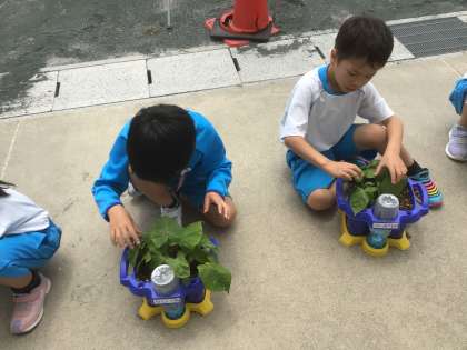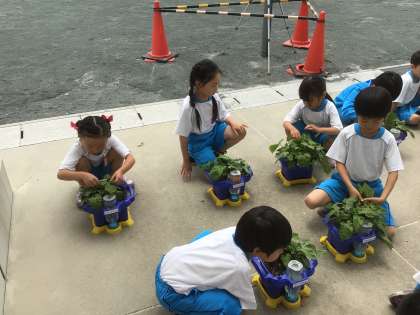 あさがおの成長を、観察しました。葉の数を数えたり、手と葉を重ね合わせて葉の大きさを比べたりして観察しました。