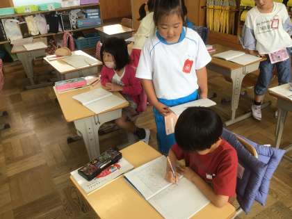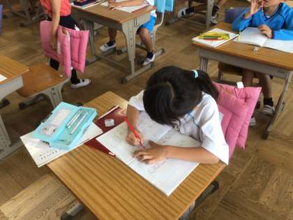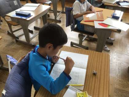 「はとわをつかおう」の学習です。文を書く練習をしています。書くときと読むときが違うので、少し難しいですね。みんなで教え合っています。