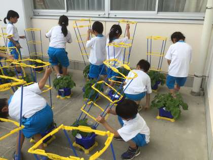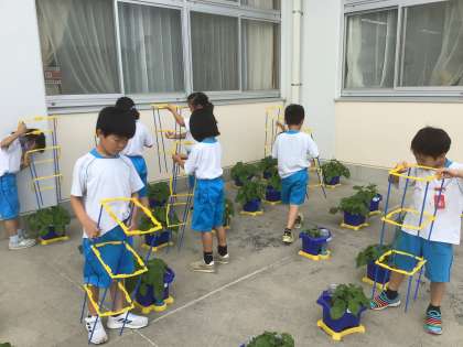 あさがおのお世話に、変化が。支柱を立てることになりました。みんなで考えて、はじめました。